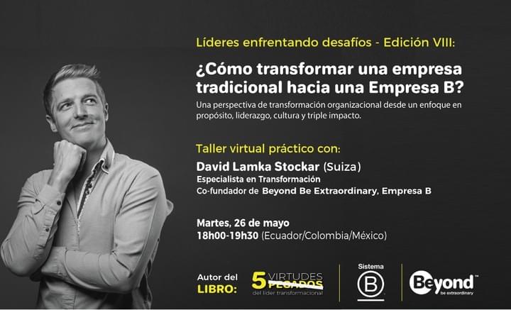 Les compartimos el libro "Las 5 Virtudes del Líder Transformacional" escrito por David Lamka, emprendedor B. En este libro el autor aporta datos sólidos, herramientas de evaluación, ejercicios de transformación y testimonios de empresarios y empresas B exitosas de América Latina para potenciar las organizaciones de triple impacto (Gonzalo Muñoz, Sergio Cardone y Carla Barbotó).